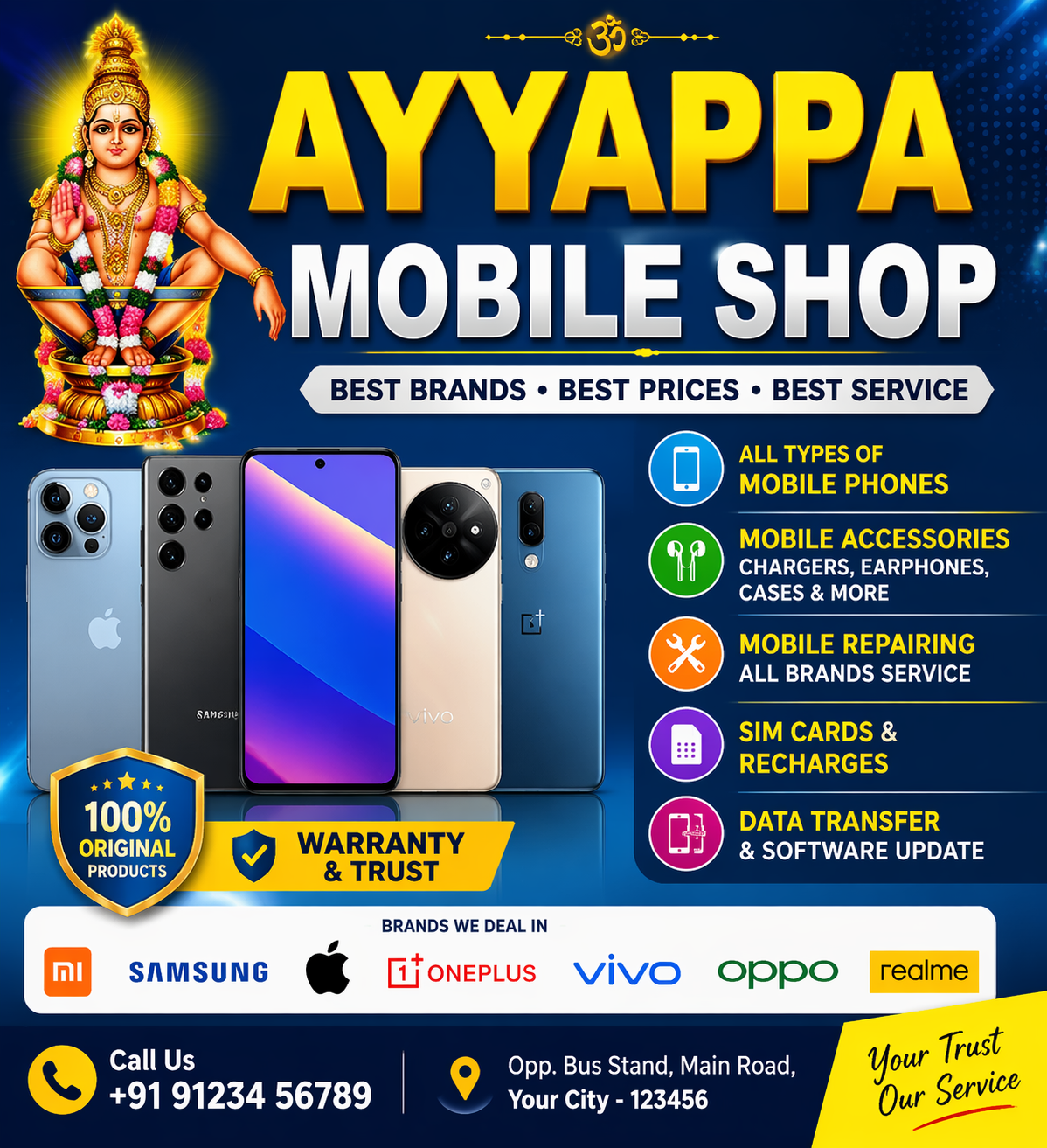Ayyappa Mobiles is a trusted destination for the latest smartphones and mobile accessories. We offer a wide range of mobile phones from top brands, catering to every budget and need. Whether you are looking for high-performance devices, stylish designs, or affordable options, Ayyappa Mobiles provides the best choices with competitive prices. In addition to mobiles, we also supply quality accessories such as chargers, earphones, cases, and screen protectors. Our goal is to deliver excellent customer service and help customers find the perfect mobile phone that suits their lifestyle.